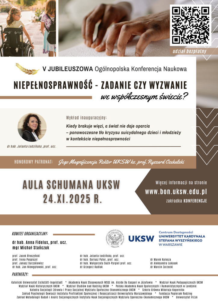 24 listopada 2025 r. w Auli Schumana UKSW organizowana jest przez Centrum Dostępności UKSW oraz Wydział Nauk Pedagogicznych UKSW, we współpracy z: Katolickim Uniwersytetem Eichstätt-Ingolstadt, ANS WSSE im. A. De Gasperi w Józefowie, Polską Akademią Nauk Społecznych i Humanistycznych w Londynie, Wydział Studiów nad Rodziną UKSW, Zakładem Psychologii Dewiacji IPSiR UW, Katedrą Socjologii Zdrowia i Pracy Socjalnej WSE UKSW, Zakładem Metodologii Badań i Analiz Socjologicznych WSE UKSW, Fundacją Popieram Rodzinę konferencja „Niepełnosprawność – zadanie czy wyzwanie we współczesnym świecie?”.