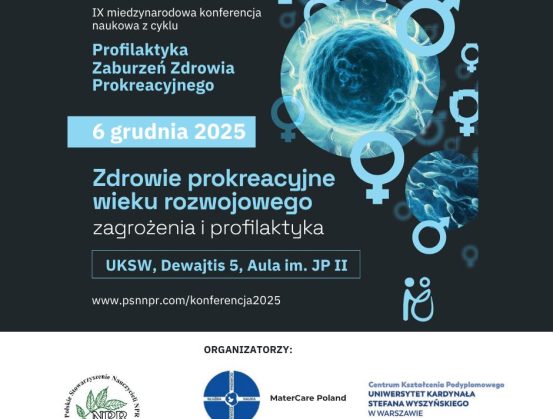 Konferencja pod tytułem „Zdrowie prokreacyjne wieku rozwojowego – zagrożenia i profilaktyka” odbędzie się 6 grudnia 2025 r. w Auli im. Jana Pawła II na Uniwersytecie Kardynała Stefana Wyszyńskiego w Warszawie, ul. Dewajtis 5. Wydział Studiów nad Rodziną UKSW serdecznie zaprasza na konferencję współorganizowaną przez Centrum Kształcenia Podyplomowego UKSW.